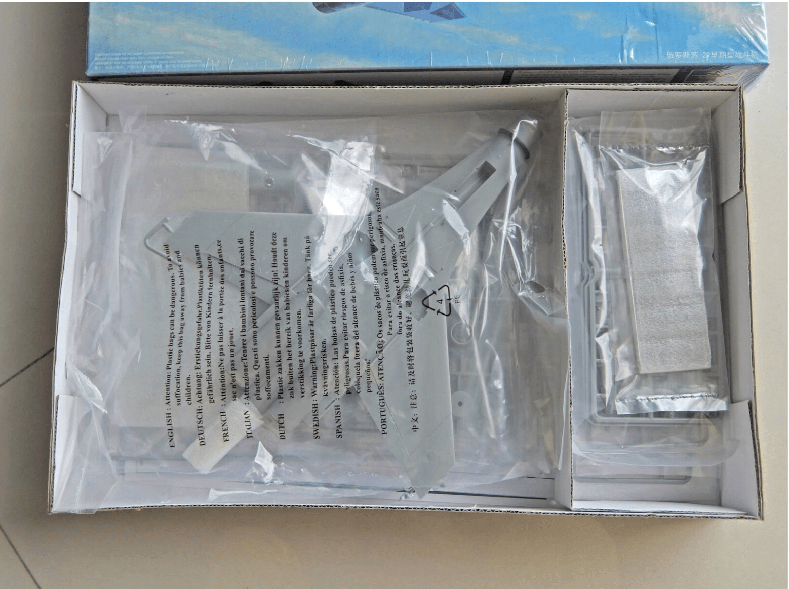 The main body of the SU-27 comes molded in two halves and held tightly with a large rubber ring on the front and some foam on the tail. It’s worthy to note how only a little piece of sprue is attached to the wing.