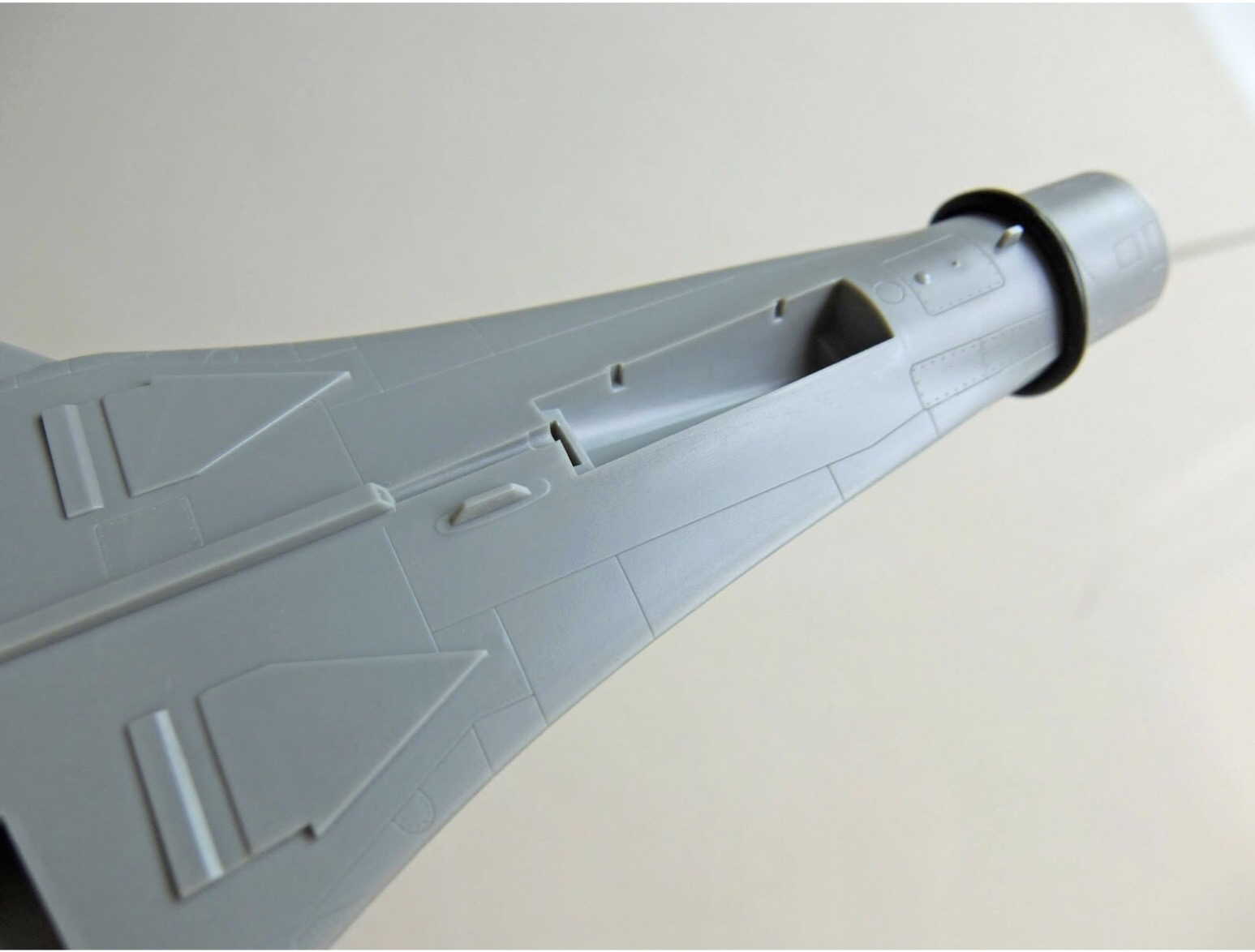 The tail boom of the early SU-27 is very different from later production versions. The side extensions are shorter and thinner. Notice the antenna molded on top, which is why it needed protection. It can be replaced by photoetched metal parts for a more accurate representation.