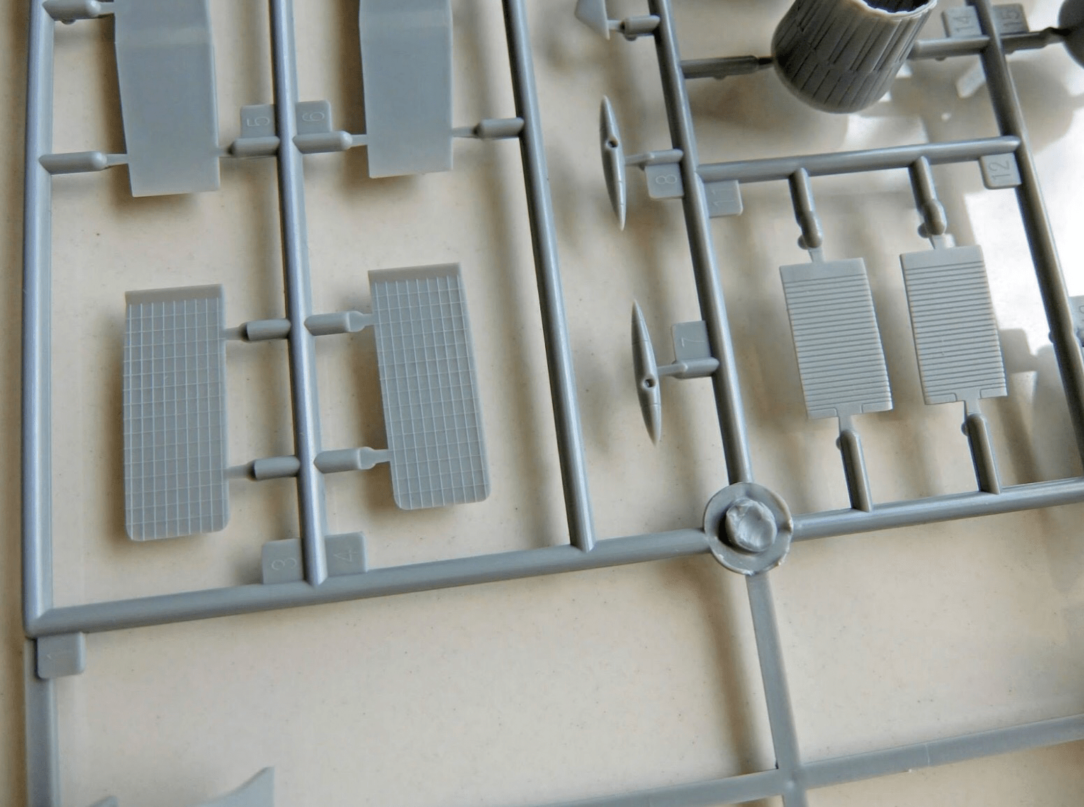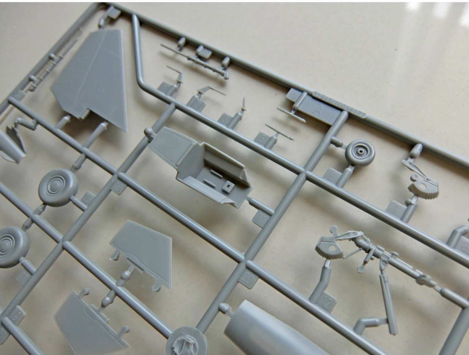 The ‘A’ sprue shows the cockpit, which lacks any detail at all. The panel instruments have to be represented by decals; I find it strange that with all the detail in this model, they decided not to mold the panel instruments, like the Hasegawa SU-33 kit did. The main landing gear is also there, which has the wrong mudguard for the early type. The early type has three vents along the side. The old Hasegawa kit comes with this kind of mudguard, might be a suitable donor.